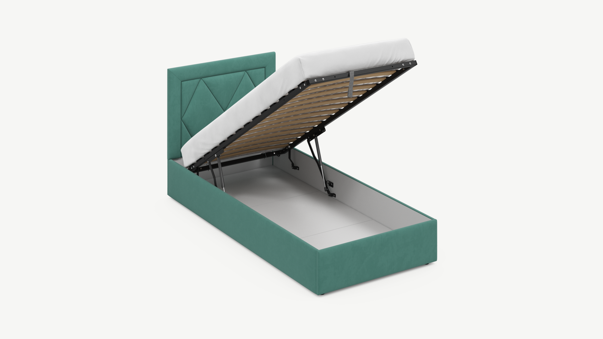 • Скрытая под основанием вместительная емкость без внутренних перегородок позволяет использовать всю площадь подкроватного пространства для хранения вещей.