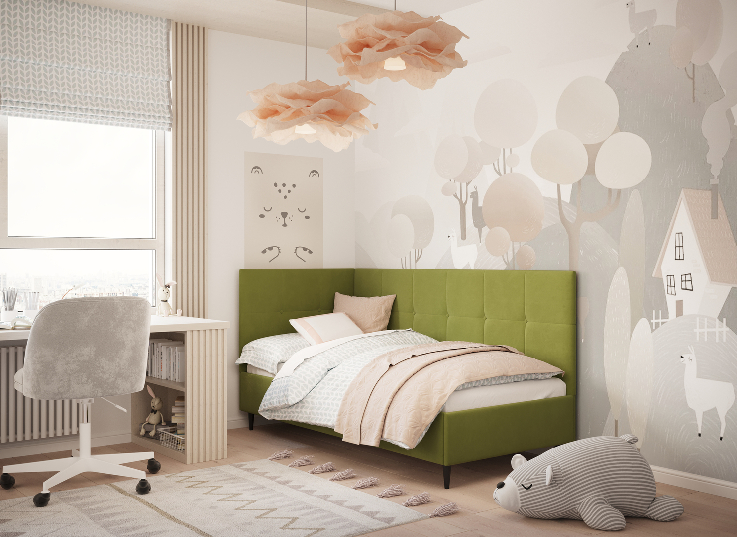 Угловая односпальная кровать MOON FAMILY 1261 с мягкой спинкой и изголовьем создаст в Вашей спальне ощущение уюта. Крупная квадратная стежка привносит в интерьер графических акцентов, а вставка из пуговиц наполняет пространство ощущением домашнего тепла.
