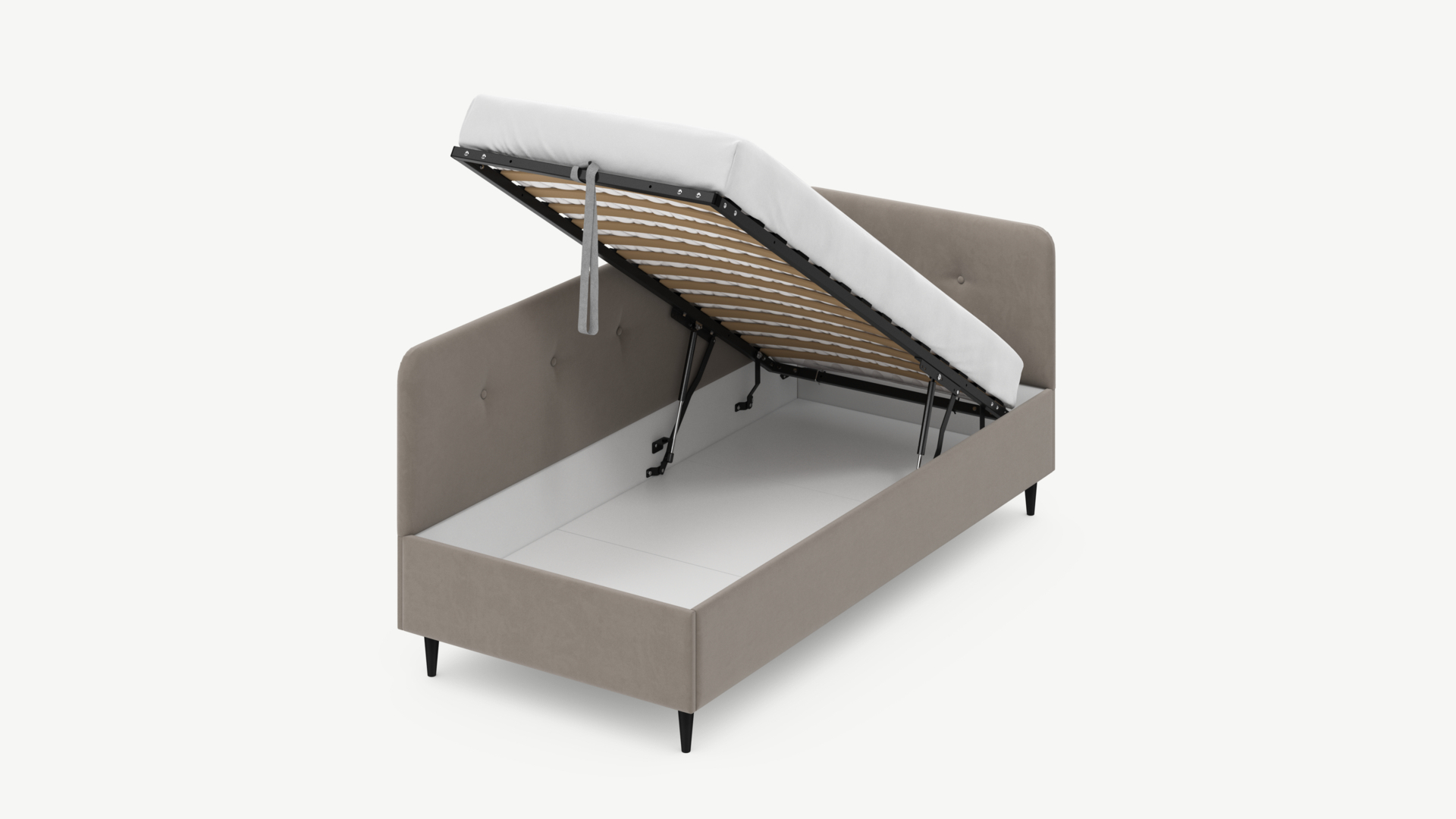 • Регулируемый подъемный механизм имеет два положения установки газовых амортизаторов в зависимости от веса матраса. Это дает возможность оптимально подстраивать угол подъема основания, а также плавно и бесшумно поднимать и опускать спальное место.
